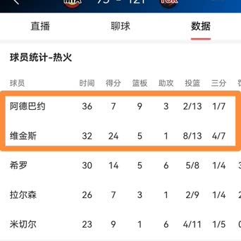 全场比赛,维金斯首发出战32分钟,投篮13中8,其中三分球7中4、罚球5中4,高效砍下24分外加5篮板1助攻。反观阿德巴约,表现极其低效,仅得到7分。